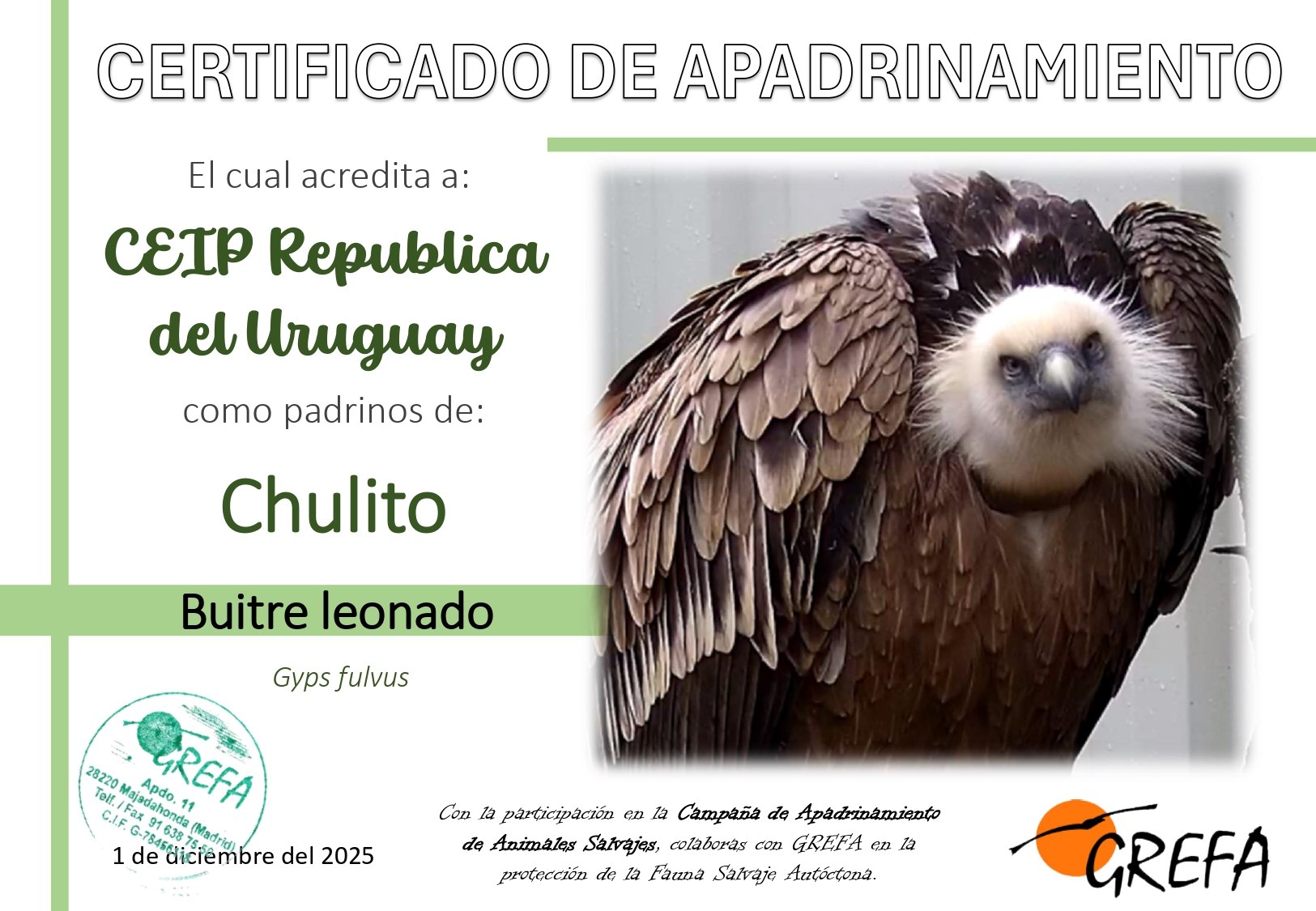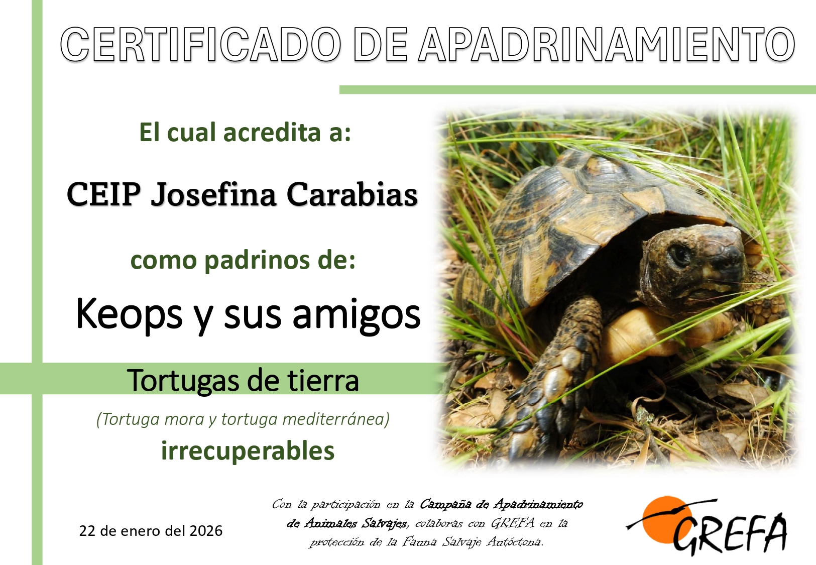 - Certificado de apadrinamiento con el nombre del centro educativo.