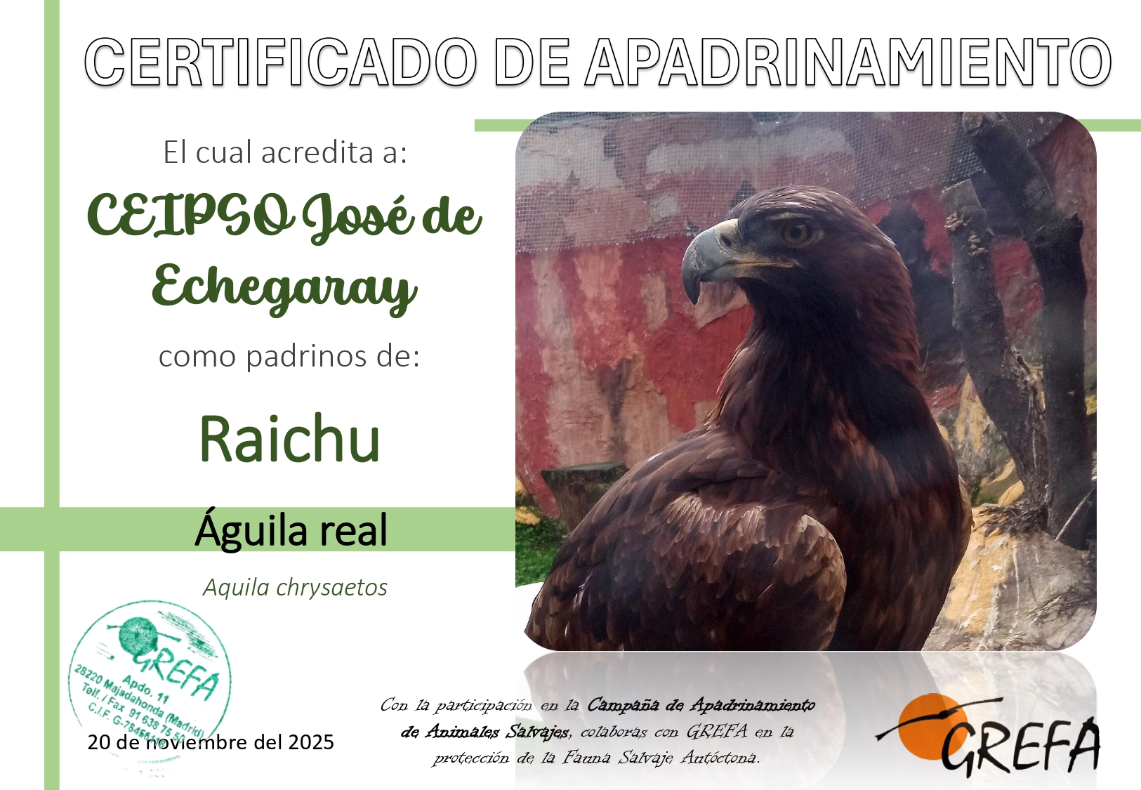 - Tres informes del animal apadrinado en formato Powerpoint, con curiosidades sobre la especie, peligros y la historia de su paso por el hospital de GREFA.